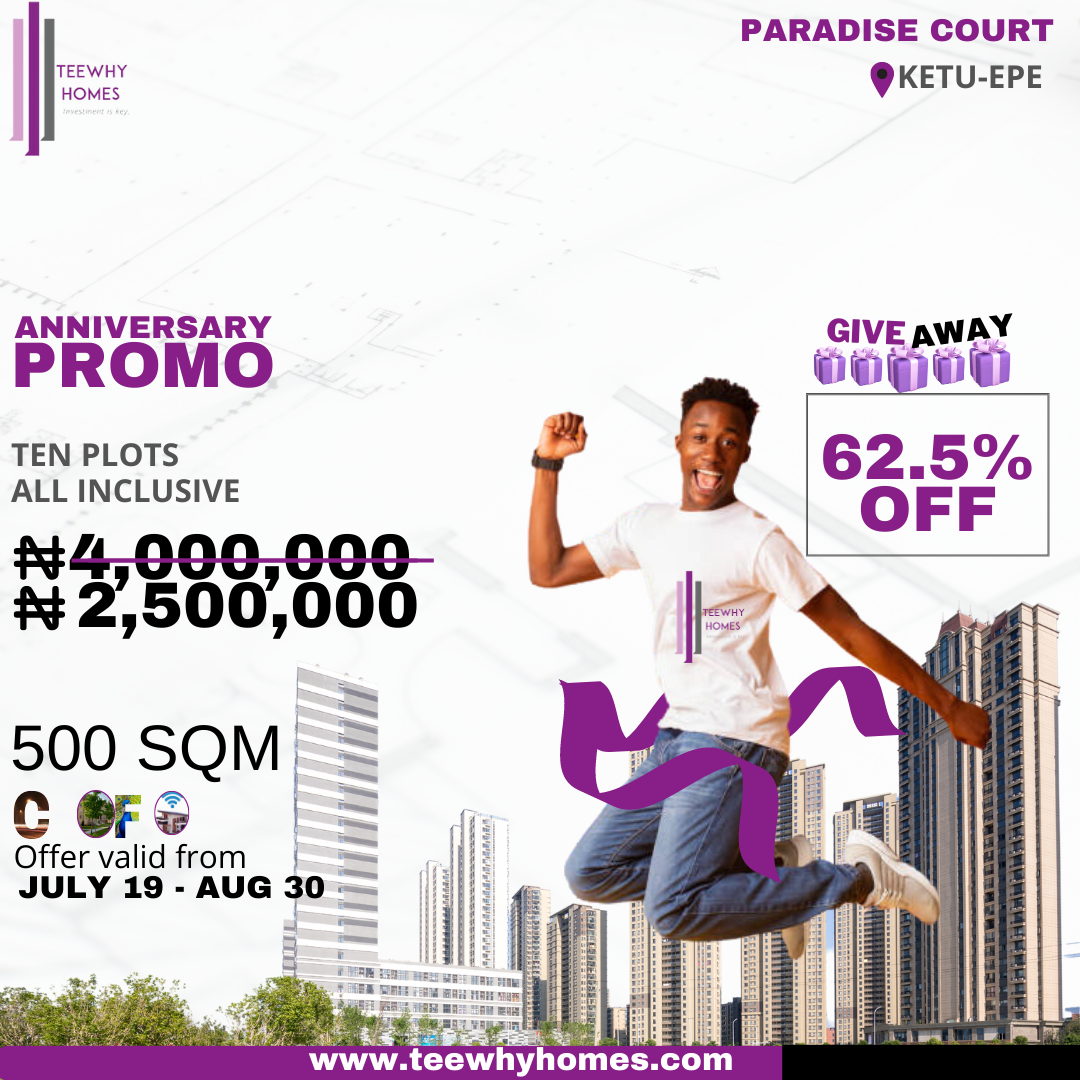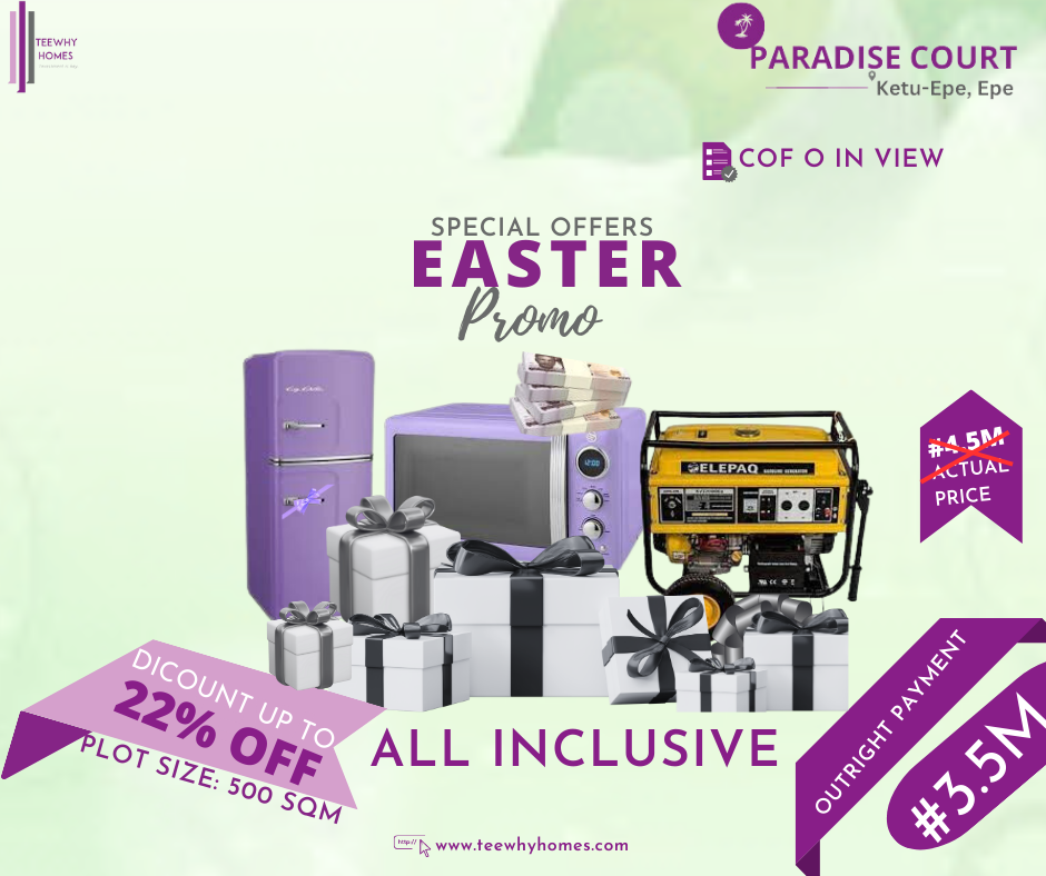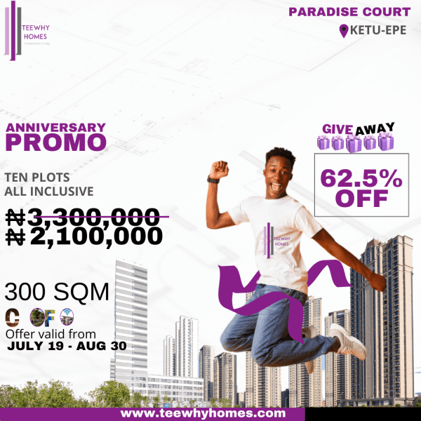 Calling all smart investors! Paradise Court offers a serene and natural haven in Ketu-Epe, Lagos State, Nigeria. Enjoy the benefits of nature and a guaranteed maximum ROI on your investment. Act now during our Independence Promo, with prices starting at #2.5M for 500 SQM. Paradise Court boasts amenities like a gatehouse, mini zoo, recreation center, solar-powered electricity, and more. Don’t miss out; the Independence Promo lasts until, October 31st, 2023. Invest in your paradise today.